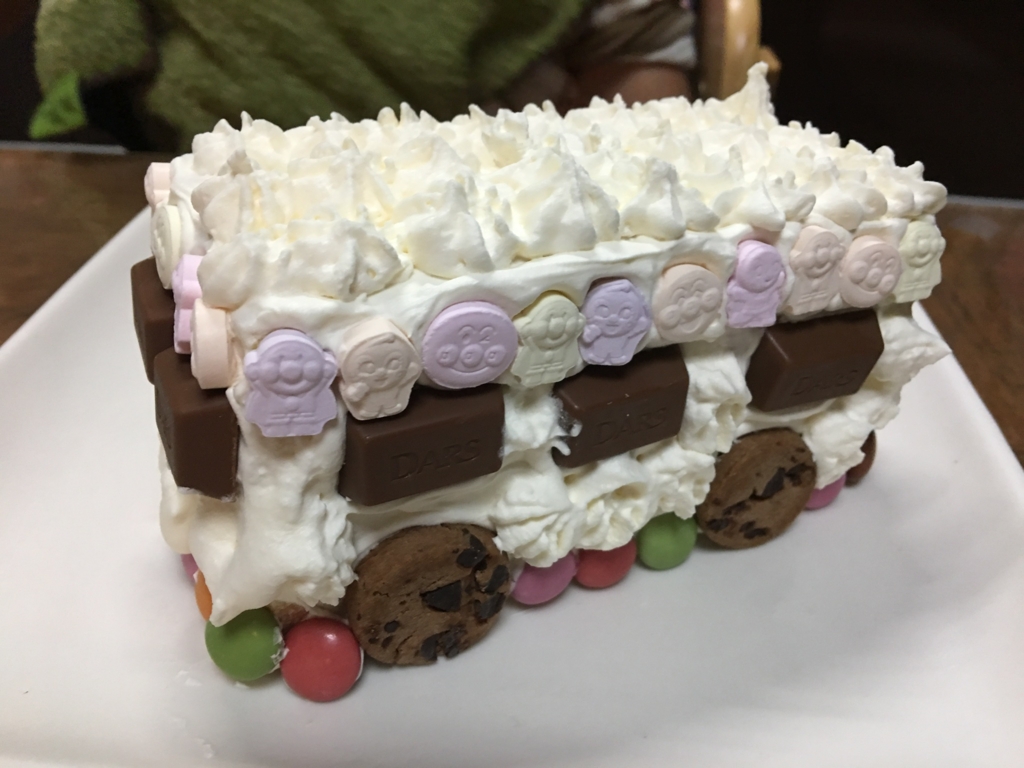 ケーキいらないというのでバームクーヘンで土台を作り、お菓子やホイップクリームでバスを🚌作ったのですが…。
